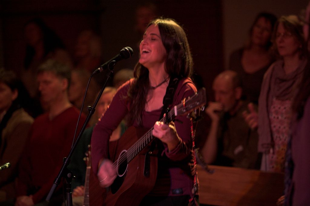 Verschiedene Musiker*innen leiten das gemeinsame Singen an. Diesmal begleiten uns: Hagara Feinbier und Raaja Fischer (Herzenslieder)